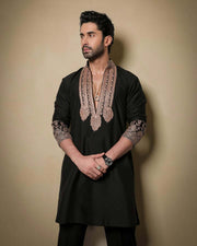 Black & Gold Celebrities Tilla Placket Kurta Pajama Set by designer Manish Malhotra - S/38